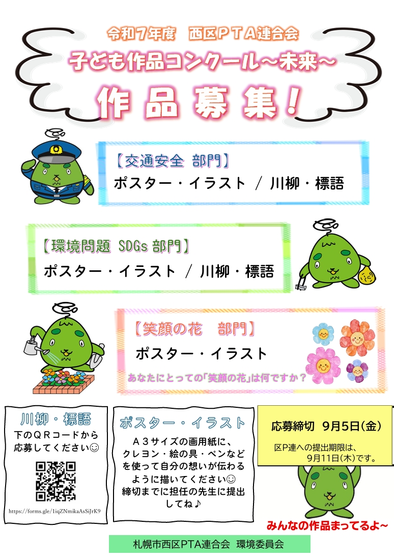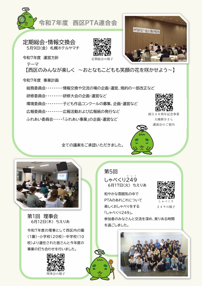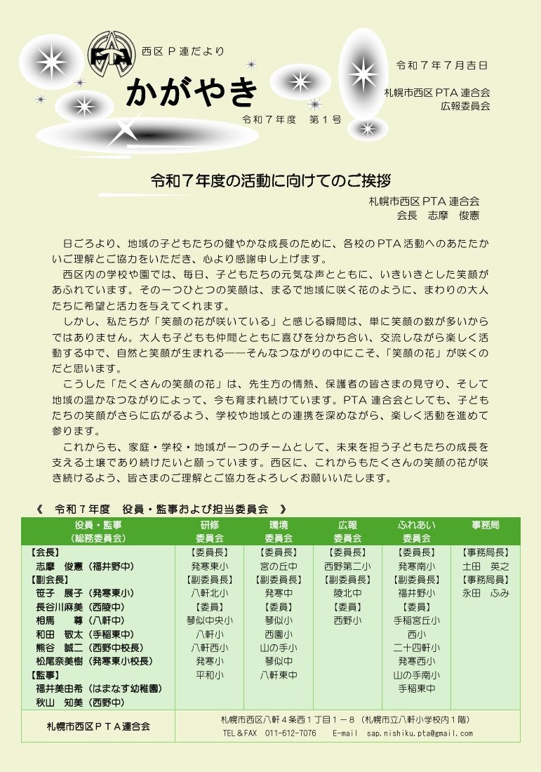 東区 西区 南区 北区 中央区 白石区 豊平区 厚別区 手稲区 清田区 このマークの付いてる区は、各区 PTA連合会のホームページにリンクします。 西区の活動 2025.07.28 西区西区P連だより かがやき 発行 令和7年度 第1号の西区P連だより「かがやき」が発行になりました。 令和7年度の役員・監事および担当委員会の紹介や、これまでの活動報告、また各事業の募集などが掲載されています。 ご家庭には、西区内の各学校を通じて紙面にて配付されています。 ぜひご覧ください! 前の記事を見る 一覧へ戻る 次の記事を見る