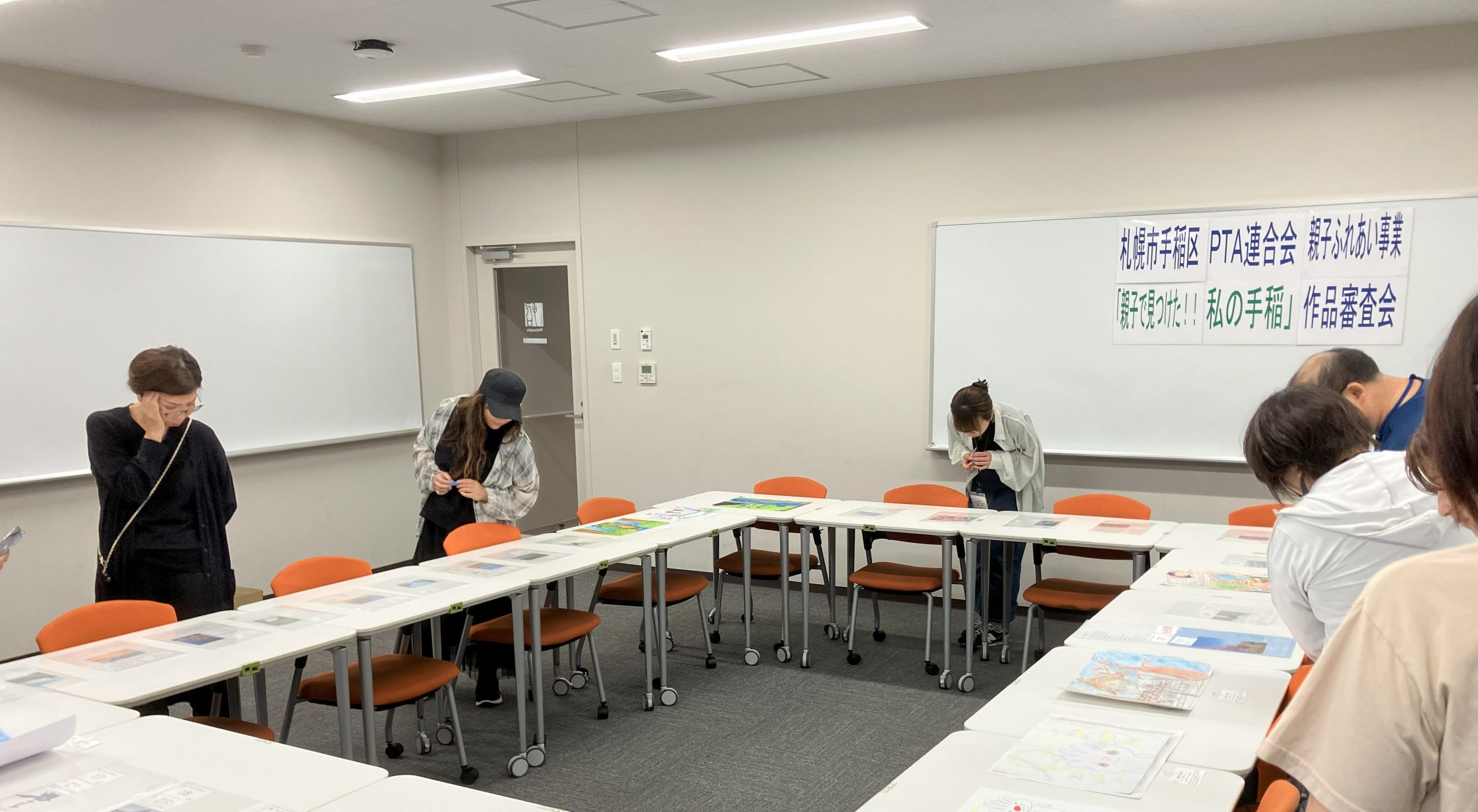 9月17日(水)に北海道科学大学図書館ミーティングルームにおいて、手稲区PTA連合会主催親子ふれあい事業「親子で見つけた!私の手稲」応募作品審査会が行われました。今年度は応募作品が34作品あり、中学生の応募は8作品、絵の作品は9作品と、とても充実していました。どの作品も応募者皆さんの思いがあり、親子ふれあいのほのぼのとした作品や私たちも知らない手稲の風景など、素晴らしい作品ばかりで審査をするのにとても苦労しました。10月中には各学校に厳正なる審査結果が届き、賞状や副賞は11月中、作品集などは2月中に届く予定となっています