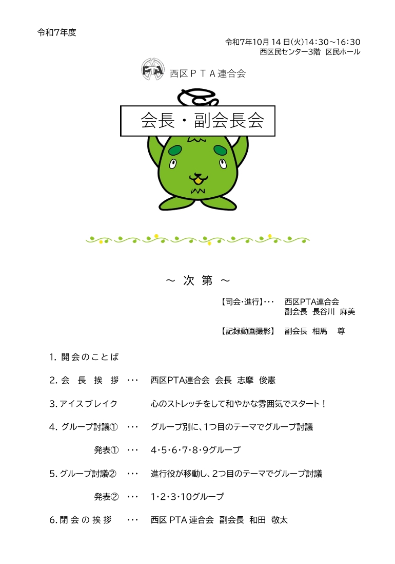 令和7年10月14日(火)14:30~ 西区民センター3階 西区民ホールにて、令和7年度 会長・副会長会が行われました。