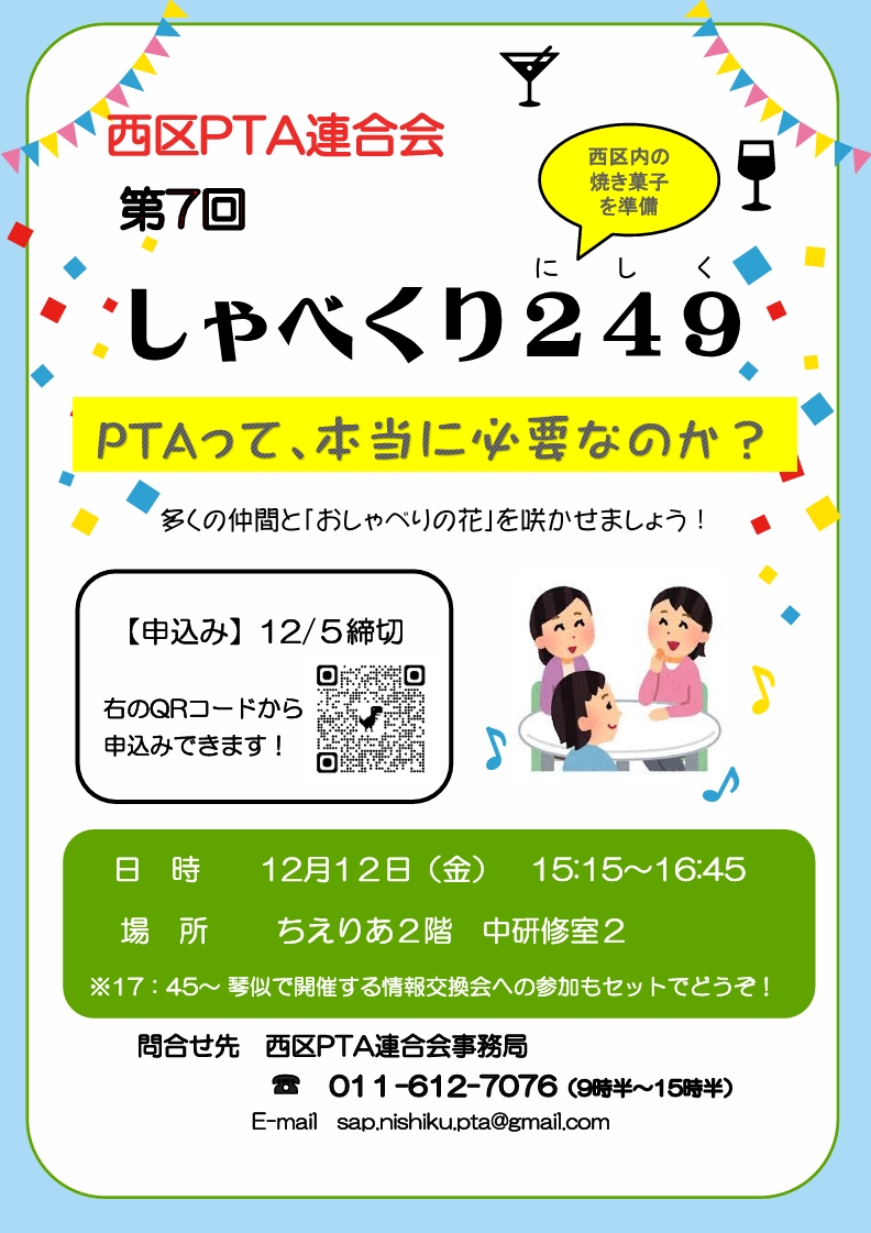 第7回 しゃべくり249 参加者募集中!令和7年12月12日(金)15:15~16:45 ちえりあ2階 中研修室2にて、第7回「しゃべくり249」が開催されます!