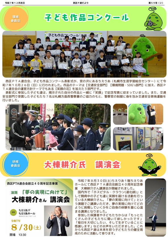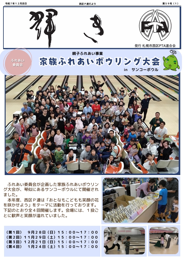 東区 西区 南区 北区 中央区 白石区 豊平区 厚別区 手稲区 清田区 このマークの付いてる区は、各区 PTA連合会のホームページにリンクします。 西区の活動 2025.12.29 西区西区P連だより 「輝き」 第59号 発行 西区P連だより「輝き」第59号が発行になりました。 令和7年度の活動の中から「家族ふれあいボウリング大会」「子ども作品コンクール~未来~表彰式」「大棟耕介さん 講演会」について掲載されています。 ご家庭には、各学校から「すぐーる」で配信されています。 ぜひご覧ください! 前の記事を見る 一覧へ戻る