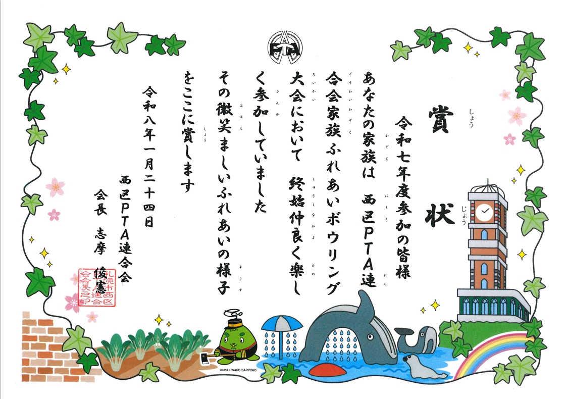 ボウリング大会参加の記念に、ご家族で考えてくだっさった【チーム名】と一緒に家族写真の撮影をして、西区P連オリジナル枠の賞状を贈呈いたしました。